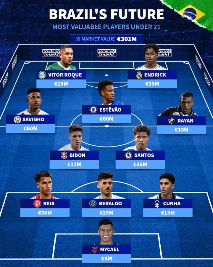 北京时间10月12号那天,德转市场那边儿列了个巴西U21球员里身价最高的阵容名单,切尔西的埃斯特旺以6000万欧元的身价排第一,皇马的恩德里克、曼城的萨维尼奥这些人都上榜了。