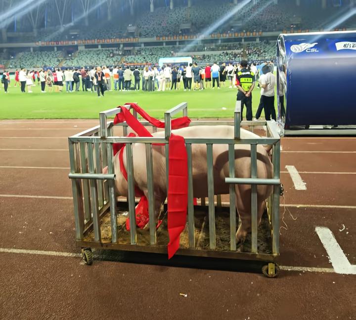 颁奖盛典上,这头400斤的“冠军巨星”被工作人员用推车隆重推至场地中央,瞬间成为全场焦点!冠军队员合影时,这头猪更是“C位出道”,抢尽风头!